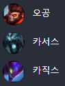카서스 : 신짜오 카서스는 초반에 굉장히 쉽습니다. 카운터정글 막 들어가주시면 카서스 녹아내리며 채팅으로 욕이 날아올 수 있습니다. 하지만 6레벨 이후 카서스 장판 및 궁으로 후반 기여도가 굉장히 높으며 짜오가 들어가도 살아남기가 힘듭니다.