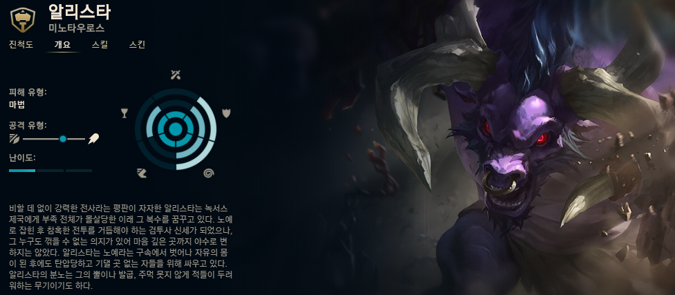 안녕하세요. 이번엔 굉장히 튼튼하며 아군 원딜을 지키는 알리스타 서폿 을 소개해보려고 합니다. 알리스타 하면 누가 떠오르시나요? 저는 UFC선수 알리스타 오브레임 선수가 떠오릅니다. 굉장히 이미지가 비슷하며 알리스타 오브레임 선수 이미지도 성난 황소같죠! 알리스타는 이니시 및 아군 주요 딜러를 지키고 적들에게 맞아도 굉장히 오래버틸 수 있습니다. 하지만 픽률은 4%대로 굉장히 저조합니다.. 알리스타 스킨 중 어둠서리 알리스타 / 정복자 알리스타 / 마법공학 알리스타 / 내가 젖소 알리스타 이 4개 스킨이 굉장히 멋진데 한번 구매해 플레이 해보시는건 어떨까요? 롤 알리스타 룬 카운터 등 한번 같이 알아보도록 하겠습니다. 알리스타 바텀조합 원딜조합은 알리스타 바루스 괜찮습니다.