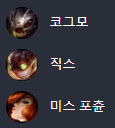 직스 : 직스 애쉬는 그렇게 힘든 카운터는 아닙니다. 다만 직스는 이동기가 있어 애쉬가 쫓기엔 무리가 있으며 나름 스킬 사거리도 긴 편입니다. 철거 속도도 빠르며 요새 많이 보이기는 하나 그리 어렵진 않으니 Q만 잘 피해 주시면서 싸우신다면 충분히 이길 수 있습니다.