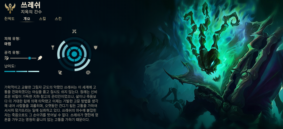 안녕하세요. 이번 시간에는 적을 끌어당기거나 아군을 살리기 좋은 챔피언 쓰레쉬입니다. 무려 24%의 픽률을 자랑하는 챔피언이며 그리 쉽지만은 않습니다. 많이들 궁금해하시는데 쓰레쉬는 영어로 Thresh 타작하다 / 탈곡하다 라는 뜻이 있으며 적의 영혼을 수집하여 붙여진 이름입니다. 영혼을 수집하면 방어력 및 주문력을 영구적으로 올리며 나름 강력한 탱키함을 가지고 있습니다. 가끔 쓰레쉬 원딜 / 미드 쓰레쉬 / 탑 쓰레쉬 가시는 분들이 계신데 즐겜 픽 아니면 가지 마시길 바랍니다. 쓰레쉬 스킨 추천은 펄스건 쓰레쉬 / 하이눈 쓰레쉬 / 암흑의별 쓰레쉬입니다. 하이눈 쓰레쉬 크로마도 있으며 펄스건 쓰레쉬 프레스티지 에디션은 지금 구할 수 없고 FPX 쓰레쉬 스킨도 나왔으니 한번 구매해보셔서 플레이 해보시는건 어떨까요? 쓰레쉬 서폿 룬 및 카운터 같이 한번 알아보도록 하겠습니다.