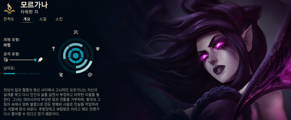 안녕하세요. 이번 시간에는 아군을 CC기로부터 지켜낼 수 있는 챔피언인 모르가나를 소개해보려고 합니다. 모르가나는 보통 미드 모르가나를 많이 갔습니다. 하지만 시대가 변하고 메타가 변하며 점차 서폿 모르가나가 더 잘 맞는 챔피언이 되었고 모르가나 서폿이 많이 보이는 추세입니다. AP 마법사 챔피언이며 모르가나 케일은 배경 설정상 쌍둥이이며 케일은 천사 모르가나는 타락한 천사 설정입니다. 모르가나 스킨 추천은 악의 여단 모르가나 / 달빛 악령 모르가나 두 가지이며 유령신부 모르가나는 퀄리티가 좀 떨어져 비추천드립니다. 악의 여단 모르가나가 그나마 모르가나 신스킨입니다. 서폿 모르가나 룬 템트리 등 같이 한번 알아보도록 하겠습니다.
